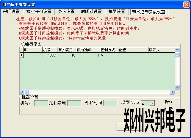雙擊要修改水控費(fèi)率的機(jī)器號(hào),在機(jī)器設(shè)置中會(huì)出現(xiàn)機(jī)器的基本信息。輸入預(yù)扣費(fèi)用及預(yù)扣時(shí)間,選擇控制方式后單擊【保存】按鈕即可。每更改一次費(fèi)率都要下載一下水控機(jī)基本參數(shù)。