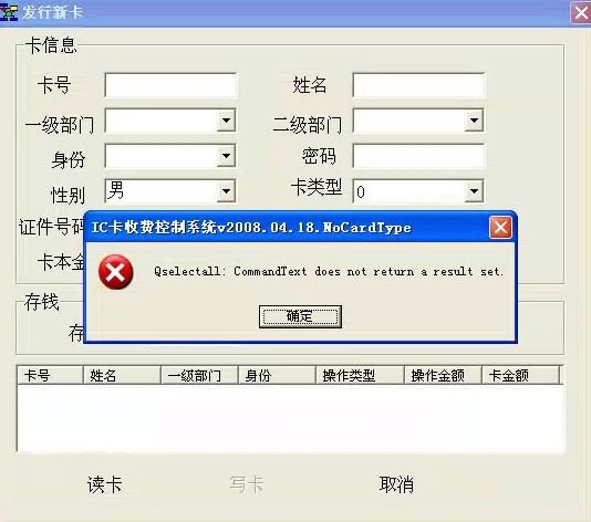 問:485水控機(jī)在發(fā)行新卡的時(shí)候提示錯(cuò)誤 “Qselectall:CommandText does not return a result set.”