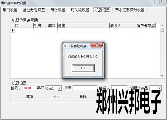 在軟件上添加水控機,售飯機相應(yīng)的機器號:打開軟件,系統(tǒng)管理---用戶參數(shù)設(shè)置---用戶基本參數(shù)設(shè)置---機器設(shè)置,在機號那添加相應(yīng)的機器號,例如10001就是1號機,串口選擇電腦所用的通訊串口。如下圖所示,圖中所用的通訊串口為COM1。但在極其特殊的情況下,會出現(xiàn)錯誤提示,機器號開頭為0。如圖所示。