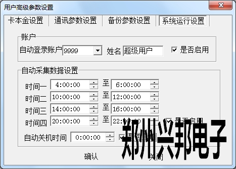自動(dòng)采集數(shù)據(jù)設(shè)置可以設(shè)置四個(gè)進(jìn)行自動(dòng)采集的時(shí)間段,時(shí)間段進(jìn)行設(shè)置時(shí)不能交叉,不能跨天,時(shí)間段時(shí)間由大到小進(jìn)行設(shè)置。在機(jī)器聯(lián)機(jī)的情況下機(jī)器可以在設(shè)置好的時(shí)間段內(nèi)進(jìn)行自動(dòng)采集數(shù)據(jù)。