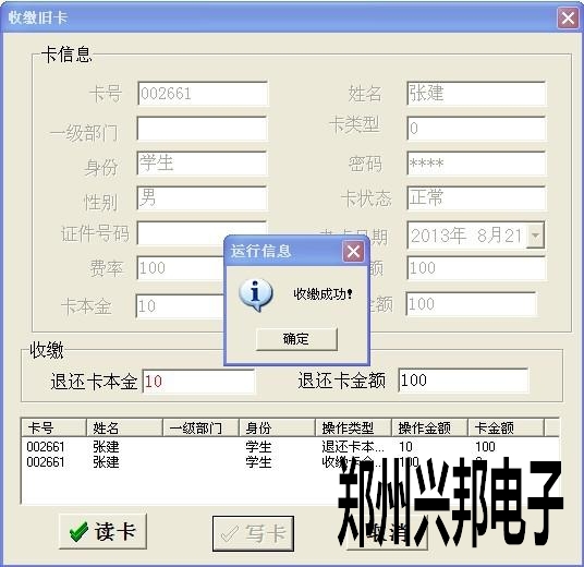 注銷卡就是收繳過的舊卡點(diǎn)擊【讀卡】出現(xiàn)卡片的基本信息后點(diǎn)擊【寫卡】,提示收繳成功后點(diǎn)擊【確定】即可。對于不用的舊卡可以使用此功能進(jìn)行收繳,收繳一定要在數(shù)據(jù)采集完成之后進(jìn)行。
