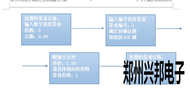 自動(dòng)模式:輸入菜肴編號(hào),點(diǎn)擊確認(rèn)后選擇份數(shù),點(diǎn)擊確任后出現(xiàn)消費(fèi)的菜肴名稱、份數(shù)、總額,將卡片放于刷卡區(qū),即可進(jìn)行扣費(fèi),扣費(fèi)后顯示扣費(fèi)金額、手續(xù)費(fèi)用、卡上余額、卡號(hào),操作流程如下圖所示: