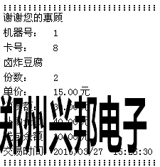 計(jì)算模式:輸入扣費(fèi)金額,按[確認(rèn)]鍵后,將卡片放于刷卡區(qū),即可進(jìn)行扣費(fèi),若連接的有打印機(jī),可直接打印消費(fèi)明細(xì),打印出的信息如下圖所示: