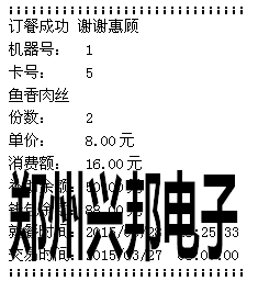 計(jì)算模式下按‘+’號(hào)鍵可進(jìn)行取餐,取餐時(shí)將需要取餐的卡放到刷卡區(qū),消費(fèi)機(jī)可自動(dòng)讀取卡片上的訂餐信息,并將其顯示出來(lái),按‘+’號(hào)鍵可翻頁(yè)查看訂餐信息,按‘確認(rèn)’可進(jìn)行取餐,取餐成功后會(huì)顯示就餐成功、菜肴名稱、份數(shù)、扣費(fèi)金額,若連接的有打印機(jī),可打印取餐信息,打印的格式如下圖所示: