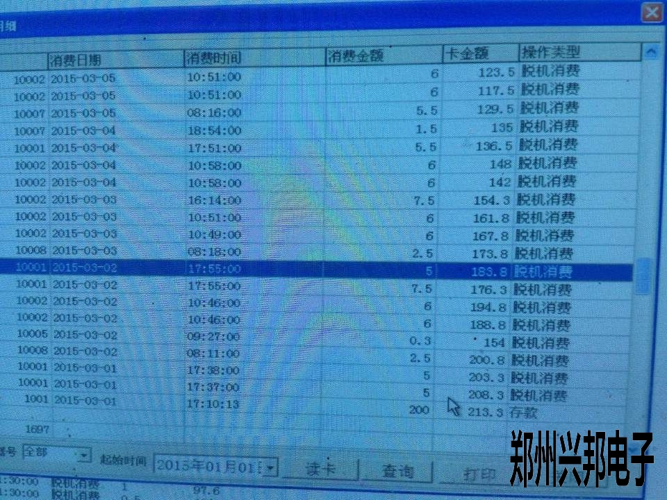 讓客戶在軟件里面查看一下個人明細(xì)表,選擇這張卡從開卡到現(xiàn)在的時間段,從下往上看,因采集的時候只顯示到分,沒有顯示到秒,所以看數(shù)據(jù)的時候要在同一日期的往上看一下,有的是沒有按順序排列的。像圖上所示的,所選擇的這一列應(yīng)該是比下面的這一列先消費(fèi)的。還有一條是10005號的對不上,5號機(jī)應(yīng)該是時間錯誤了,這條應(yīng)該是3月3 號的消費(fèi)數(shù)據(jù)。把5號機(jī)校一下時,下載一下參數(shù)就可以了。這種問題就解決了。