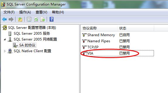 4、打開SQL Server 2005中的配置工具SQL Server Configure Manager,將VIA協(xié)議禁用
