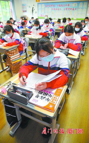 廈門網(wǎng)訊(廈門晚報(bào)記者郭文娟林珊吳笛圖/劉東華)今天早上,全市近1.6萬(wàn)名高三學(xué)生重返課堂。距離高考只有三個(gè)月了,老師勉勵(lì)學(xué)子們:“寧吃百日苦,不留終生憾!”校園里張貼的紅色標(biāo)語(yǔ),也為學(xué)生們加油鼓勁:“努力到無能為力,拼搏到感動(dòng)自己!”