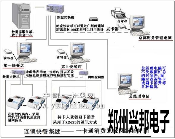 由上面網(wǎng)絡(luò)拓?fù)鋱D,我們可以知道,針對跨區(qū)域的連鎖快餐店的情況,我們需要通過多種通訊方式和協(xié)議來滿足現(xiàn)有環(huán)境的一卡通行。這樣即能很好的完成公司的投資效果,又可以保證持卡人的真正方便和實惠,更可以為公司節(jié)約投資費用;并且為公司的后期一卡通系統(tǒng)的再投資和再擴展預(yù)留了全部軟硬件接口。