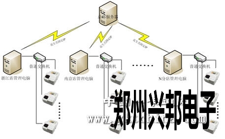 如上圖所示,整個系統(tǒng)的管理電腦單獨存在,在剛開始建設(shè)時就把各個分店的電腦數(shù)據(jù)庫單獨建立,制作卡片時,通過卡片的號碼段位來區(qū)分各店的范圍,只是在需要傳輸數(shù)據(jù)時,通過花生殼軟件等工具綁定IP地址,使各家分店和總部服務(wù)器之間的通訊無地理的局限,實現(xiàn)整個系統(tǒng)數(shù)據(jù)的實時交換。