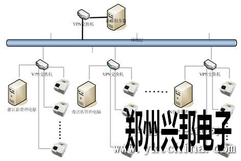 如上圖所示,把整個系統(tǒng)的管理電腦納入到VPN局域網(wǎng)絡(luò)中來,使各家分店和總部服務(wù)器之間的通訊無地理的局限,實現(xiàn)整個系統(tǒng)數(shù)據(jù)的實時交換。